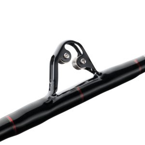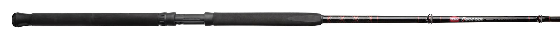 The Rampage rod is designed to be a workhorse for charter boats or anglers that need durability in a variety of fishing situations. Constructed with a tubular glass blank for extra strength. the Rampage also features a solid glass tip that helps keep the rod tip from breaking. even when high sticked. A heavy duty Pac- Bay reel seat ensures a secure lock on the reel foot. eliminating flex while under heavy load. Each rod features guides built with heavy duty stainless steel frames and aluminum oxide inserts that are perfect for both mono and braided lines. The soft yet durable rubber gimbal is used on select models providing the same function as a traditional metal gimbal without the worries of scratching or cracking the gel coat on your boat. Rubber gimbals also help ease the pain that traditional metal gimbals can put on your body while fighting a fish. EVA Torque grips are contoured to fit your hand perfectly and eliminate the rod from twisting while under heavy load.