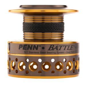 The Penn Battle Spinning Reel Kit pairs the high-performing Battle II reel with a spare anodized aluminum spool and a durable neoprene reel cover. The extra spool gives anglers the added convenience of being able to quickly switch between various line types. While the high-quality neoprene reel cover protects the reel from scrapes and dings while being transported. The Battle II Spinning Reel offers a durable design. sleek cosmetics. and a silky smooth HT-100 drag as just a few of the many reasons why so many anglers use it. The Full Metal Body construction allows the reel to maintain precision gear alignment under severe punishment. With the Superline Spool. no backing is needed because of the rubber gasket that keeps superlines from slipping. An unbeatable value for the price point!